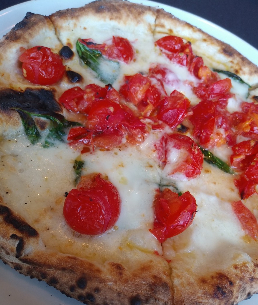 基本マルゲリータと同じ材料で作られていますが、完熟チェリートマトと厳しい生産規定D.O.Cに認定された水牛ミルク100%のボッコンチーニチーズを使用した、シンプルなのに贅沢な1品です。